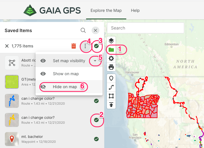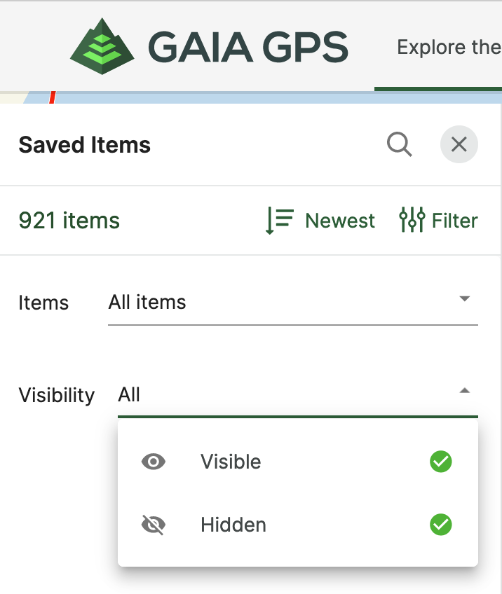 I want to hide them all, then turn on selected tracks. I see the Filter options for Saved Items, but they don't seem to do what I want. If I click Hidden, then click Apply, the map doesn't change (that is, the tracks aren't removed/hidden from the map.)