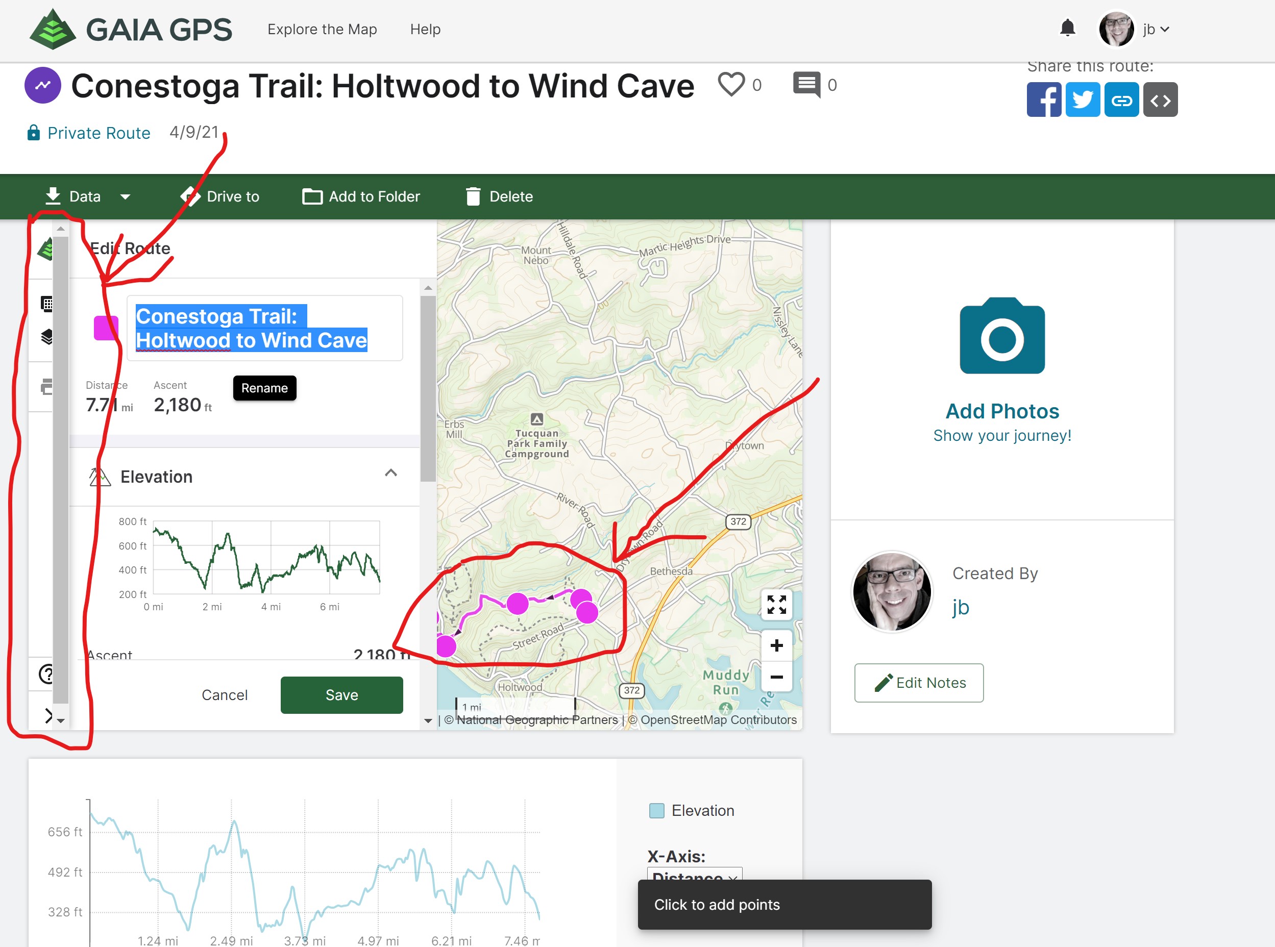 To edit a route, you click edit next to the name--which implies renaming, not changing the route. The route and waypoints are mostly obscured, making editing nigh impossible.