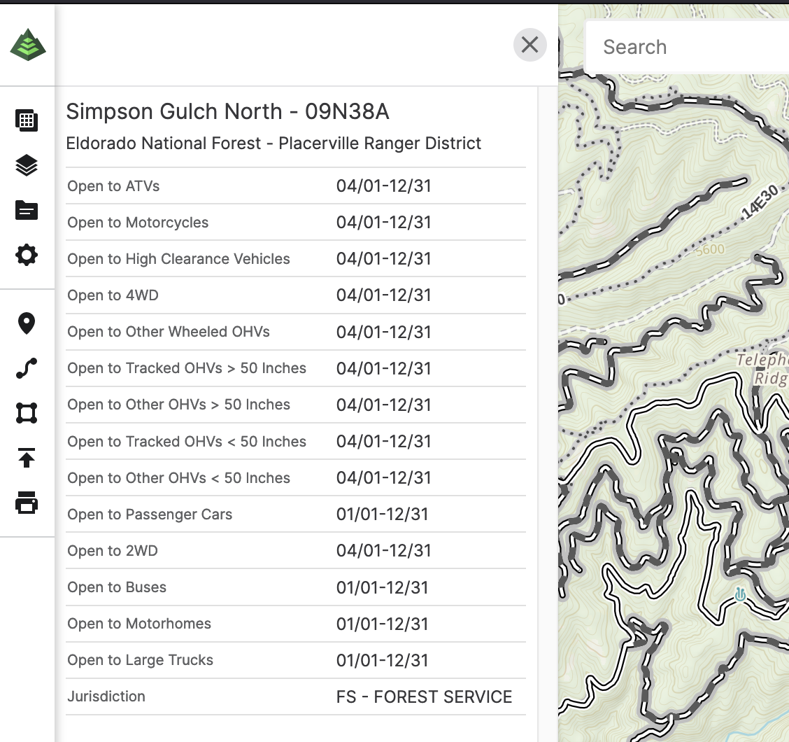 This information may be on the MVUM (USFS) layer for certain roads. This data is from the US Forest Service and is generally for dirt roads, not highways. However, it may be useful to you depending on where you are going.