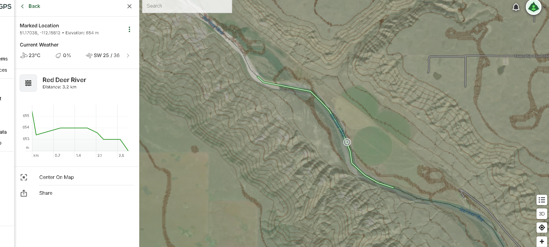 Here is another example - the red deer river and there's the line. I have Gaia Topo in meters on full view and Sat Topo selected as well with set to about 40%........