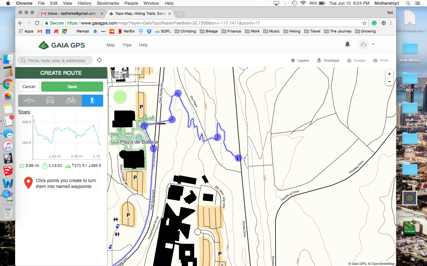 There was a missing section of trail that was preventing your route from snapping correctly, sorry about that. I added the missing section to Gaia Topo and you should be able to create the route as you want in about a week.