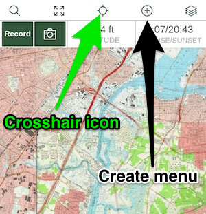 The crosshair icon will turn red after tapping it to indicate that the main map will be centered on your location. The Create menu is where you will have the option to make a new waypoint, route, or download an offline map. Check out these articles for more information:
