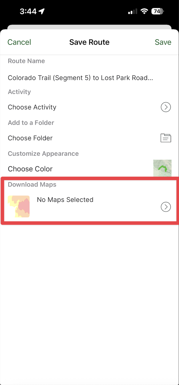From the Name and Save screen, tap Download Maps. Toggle on the layers you want to download for offline use. If you'd like to create additional routes while offline, make sure the Offline Route Data is toggled on.