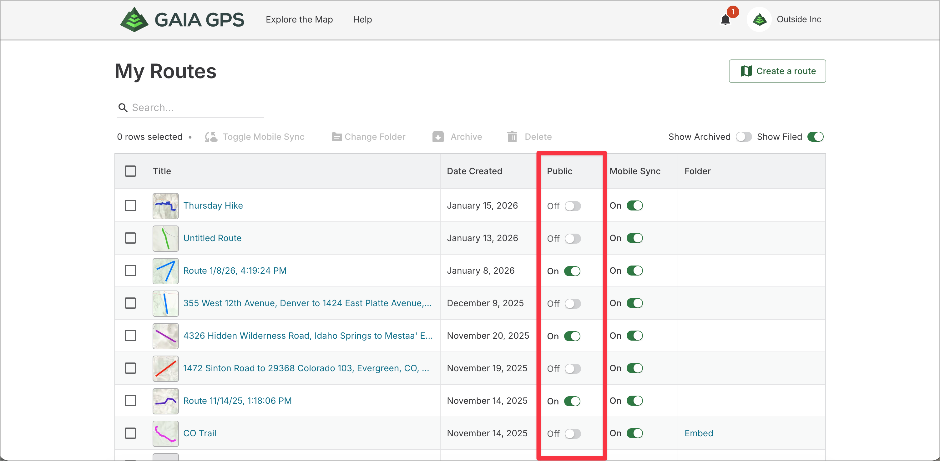 Note: You cannot change the privacy of your tracks, waypoints, and routes in bulk. You can bulk delete items, toggle sync on/off, and change folders of items in bulk, but you must change the privacy of each item individually.