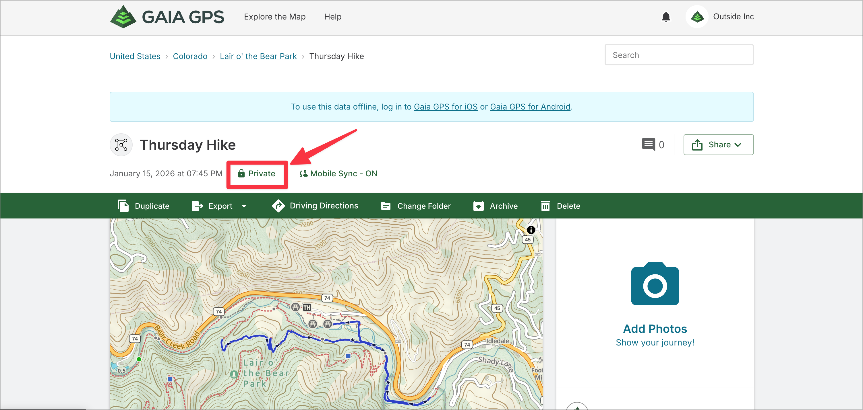This article will show you how to change the privacy setting of your data from gaiagps.com. Public data can be viewed by other Gaia GPS users. Private data can only be viewed by you and the people you share it with. To set the default privacy of your tracks and data, please see this article on privacy & data controls.