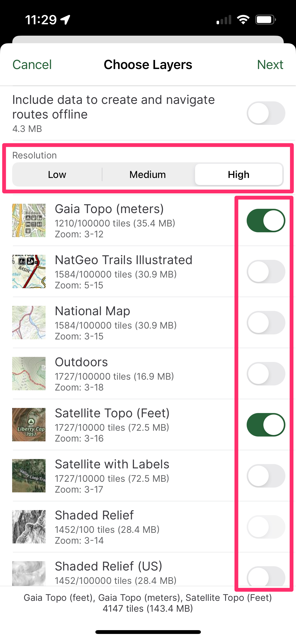 This article will show you how to download maps for a track, route, or area in the iOS app. You can use the 'Download Maps for Track, Route, or Area' feature to download an offline map that follows your track, route, or area. This downloads 5 map tiles (individual images that make up a digital map) on either side of your route or track. Because the tile size is different for different sources, the width of the map may vary slightly depending on the selected map source and the location of the track/route/area.
