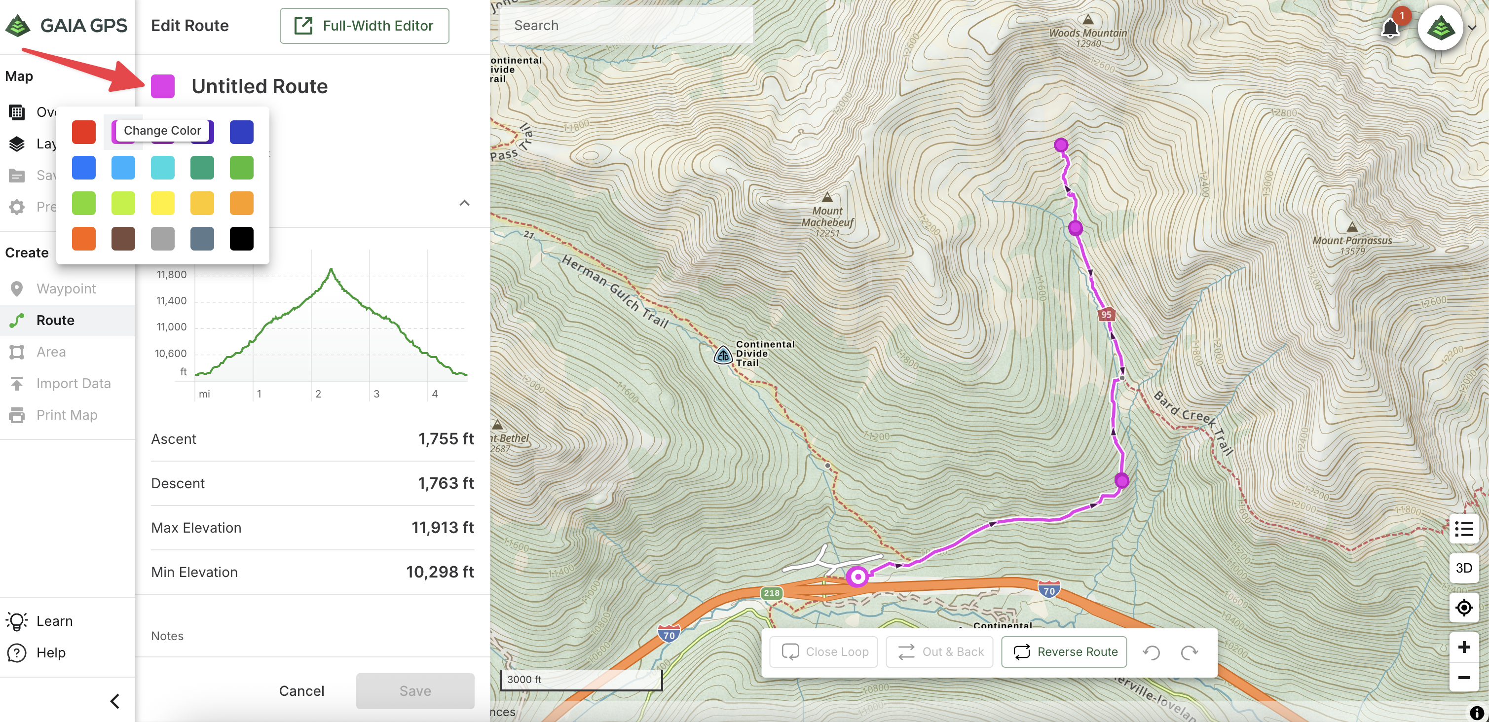 To change the color of the route, click the color icon to the left of the title, then select a color from the palette.