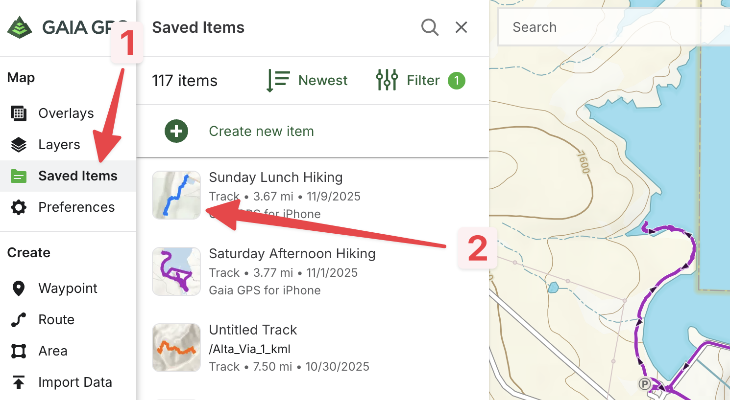 For Tracks and Areas, from the main map, click on the Save Items folder icon on the left side of the screen to open the Saved Items sidebar