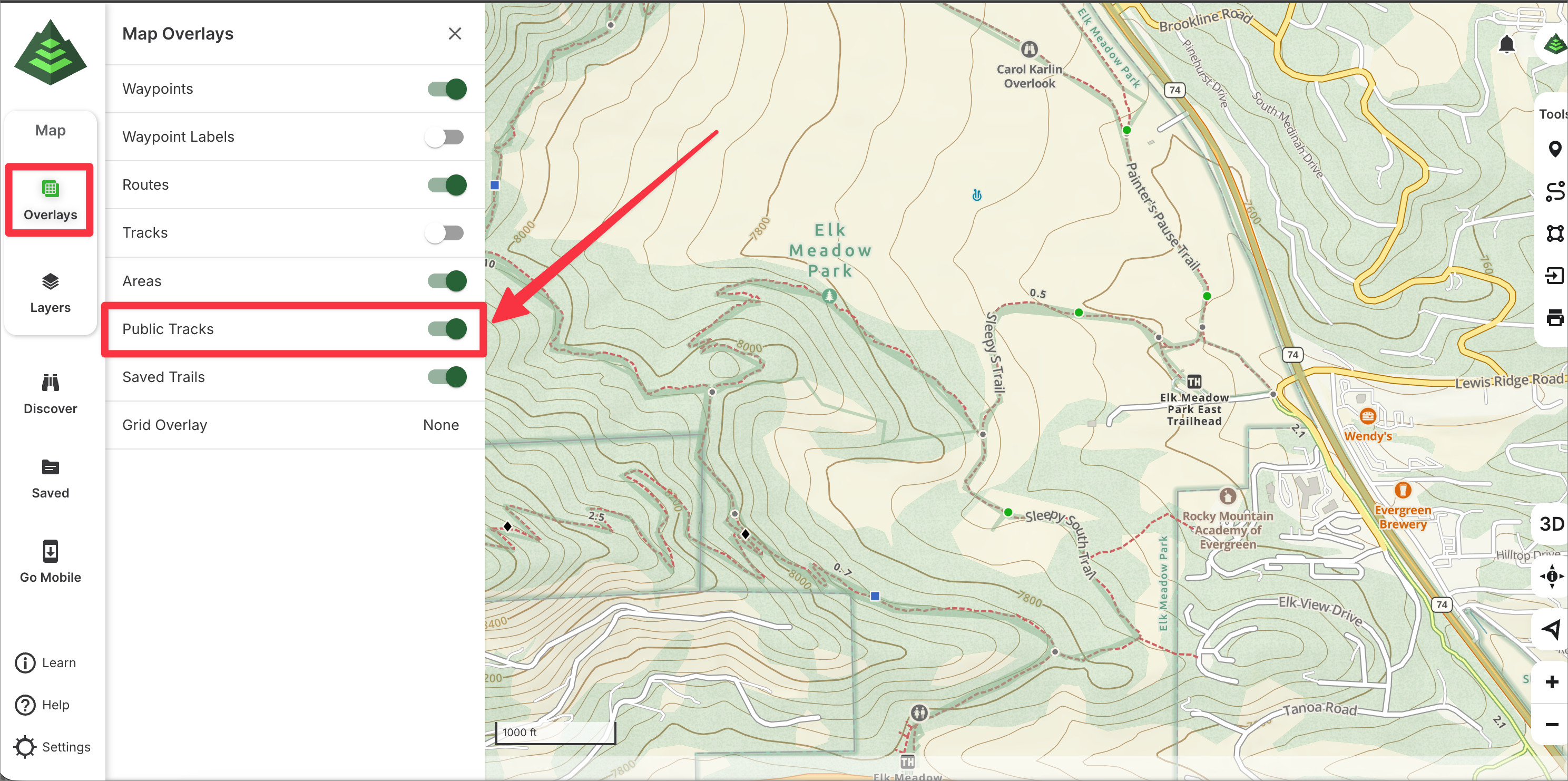 1. Click the Overlays menu on the left side of the map and then toggle on Public Tracks. The public tracks will show as darker green lines on the map.
