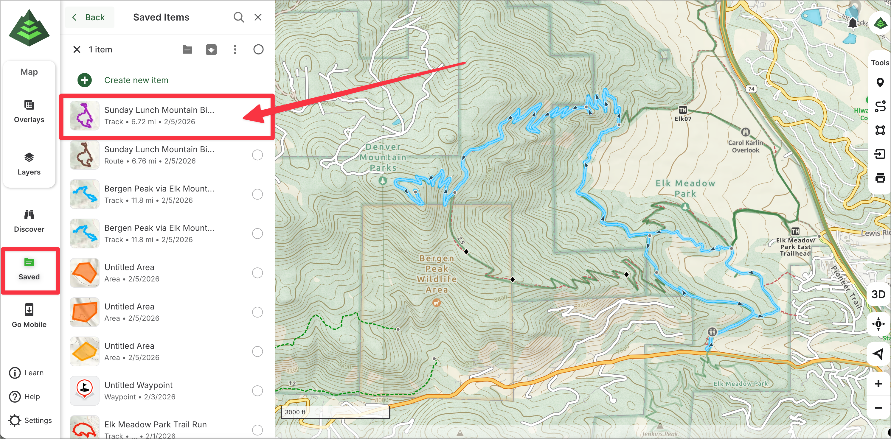 7. The track will now appear in your Saved menu. Tap the Saved icon in the bottom menu bar to see your saved data. From here, you will be able to rename the track or change the color.