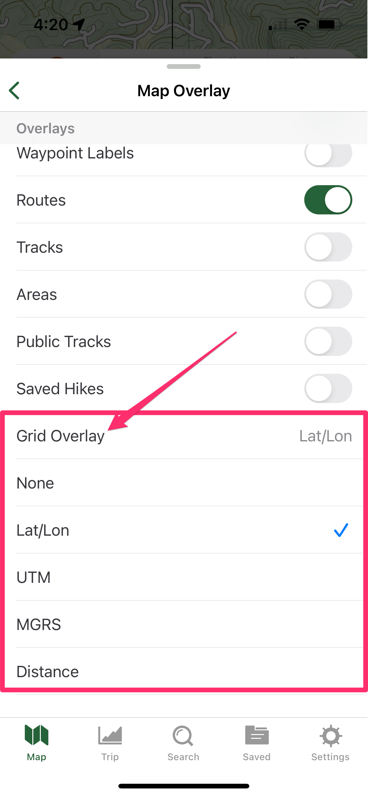 This article explains how to activate grid line overlays in Gaia GPS for the iOS app. You can choose between Lat/Lon, UTM, MGRS, and the Distance grid overlay.