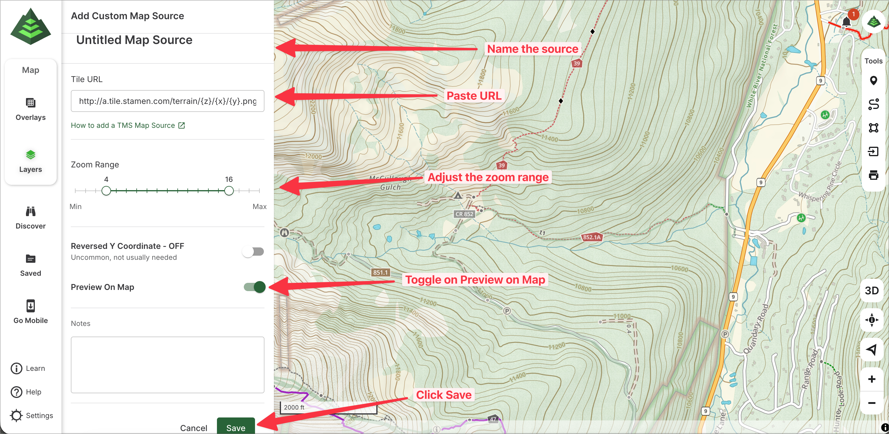 In this article, you will learn how to find the URL for a TMS map source and how to add that source to Gaia GPS.