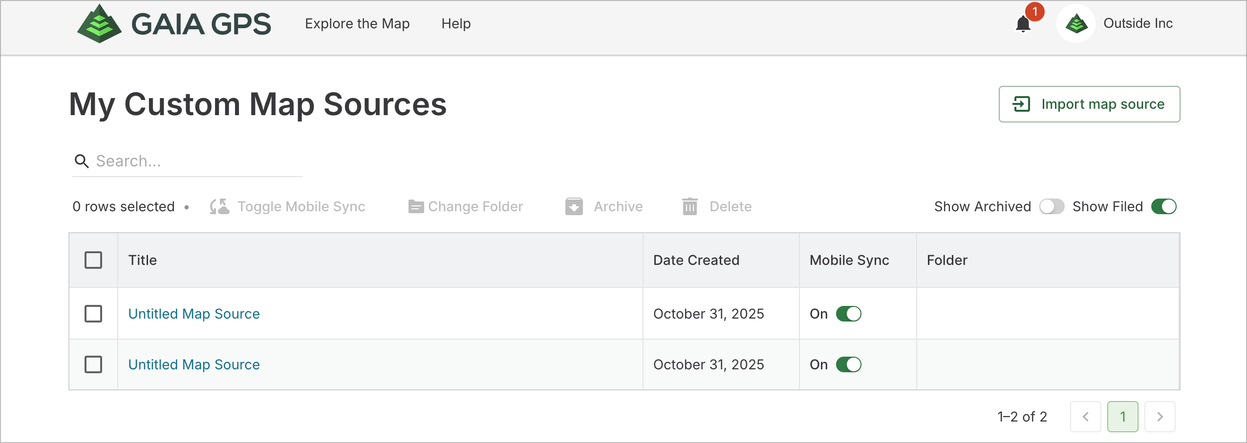 On gaiagps.com, add and manage your map sources by going to your custom map sources list. You can also access that list by clicking the account menu (at the top right) and selecting "Custom Map Sources."