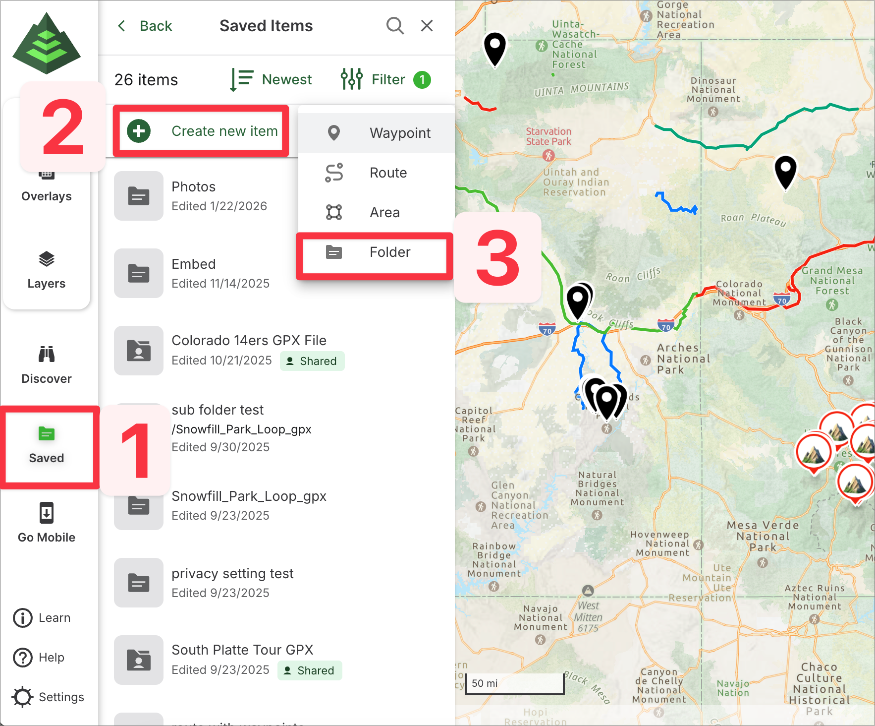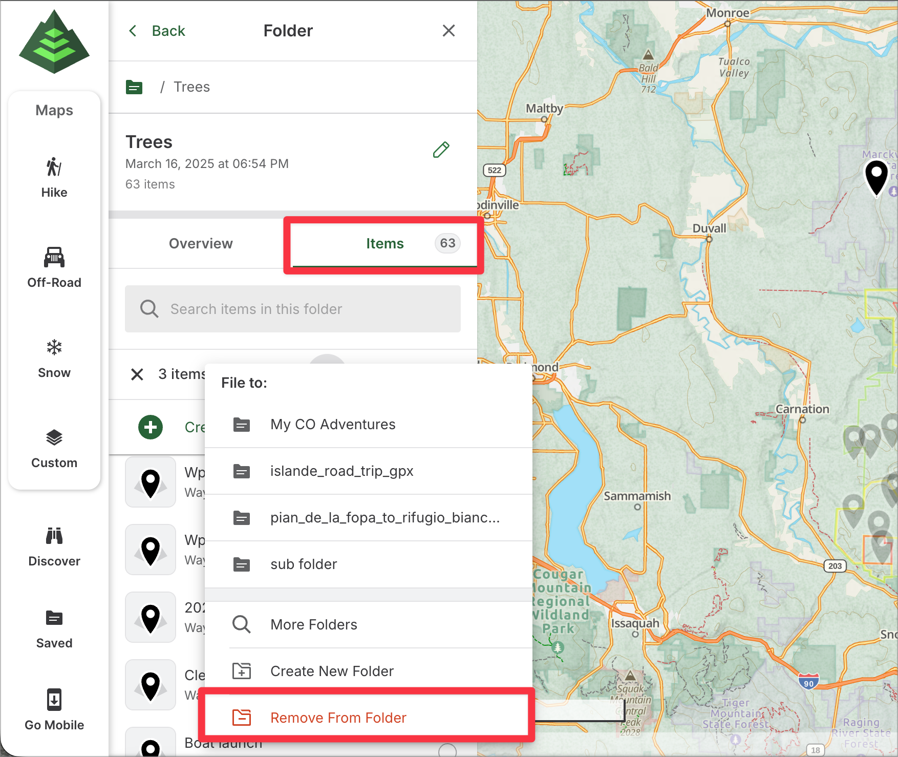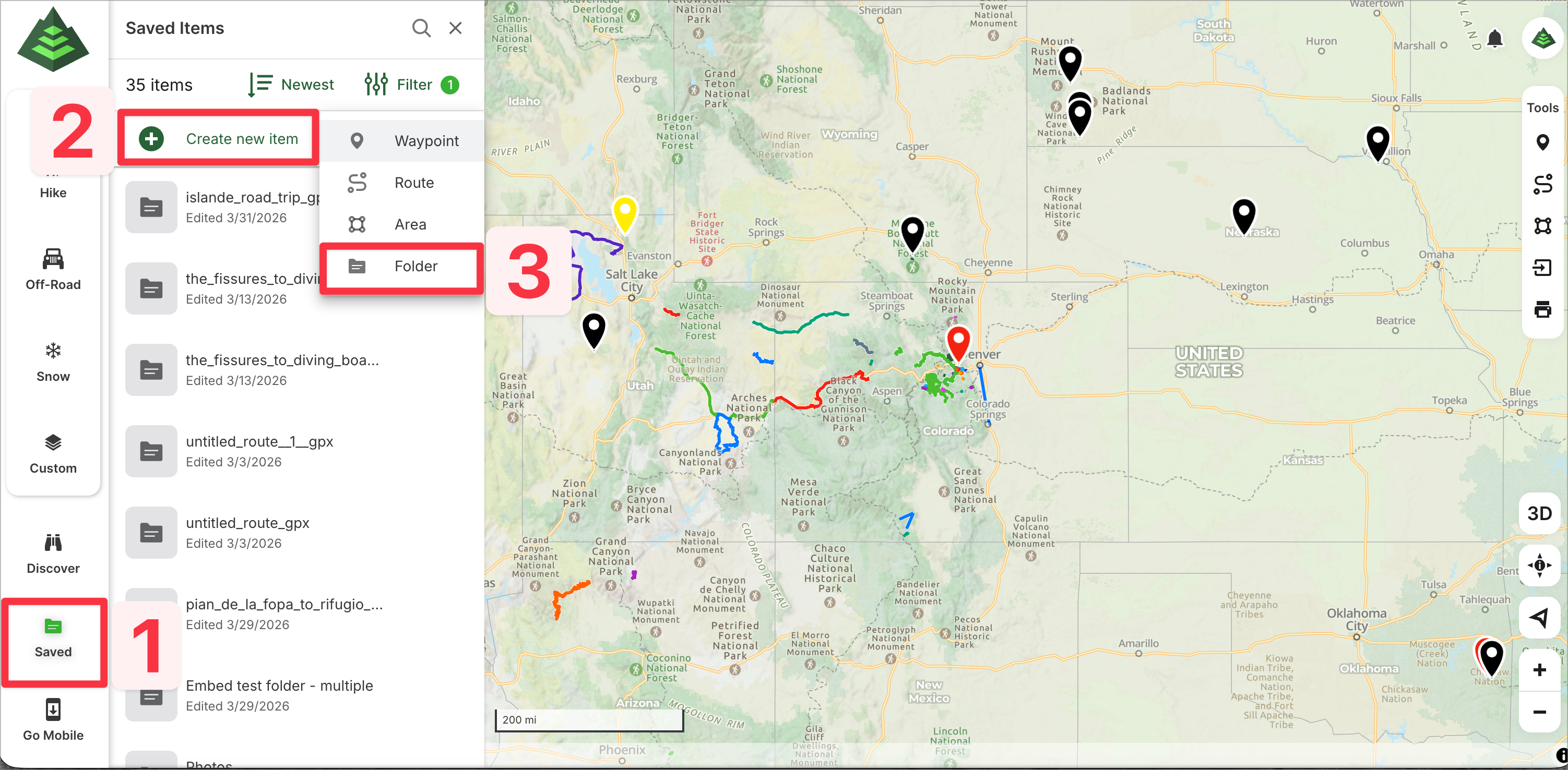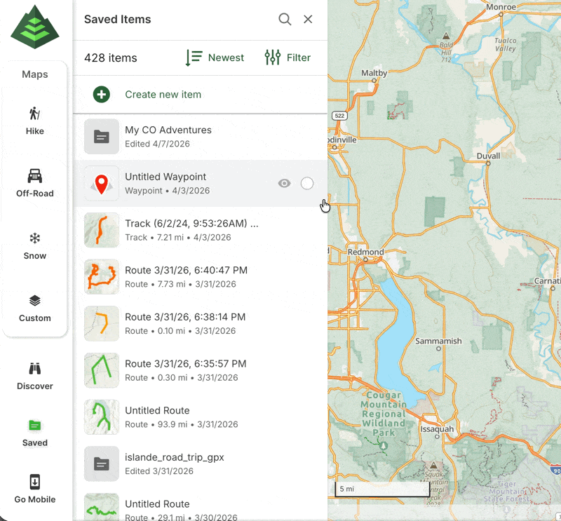 This article will guide you through managing folders on GaiaGPS.com. From the saved items sidebar on the web, you can easily view and organize your folders. Folders help you keep your planned routes, recorded tracks, waypoints, and other items neatly organized for quick access and better navigation.