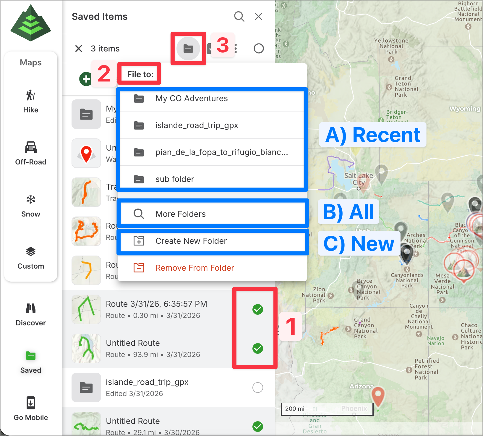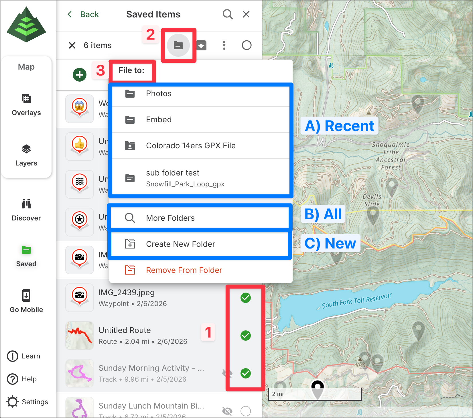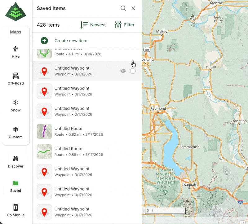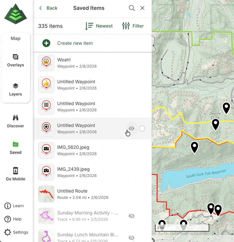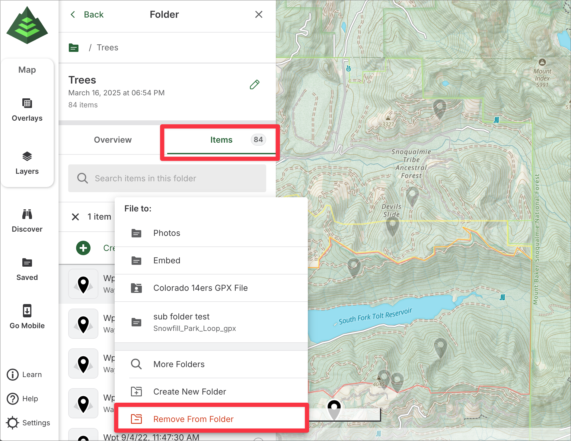 This article will guide you through managing folders on GaiaGPS.com. From the saved items sidebar on the web, you can easily view and organize your folders. Folders help you keep your planned routes, recorded tracks, waypoints, and other items neatly organized for quick access and better navigation.