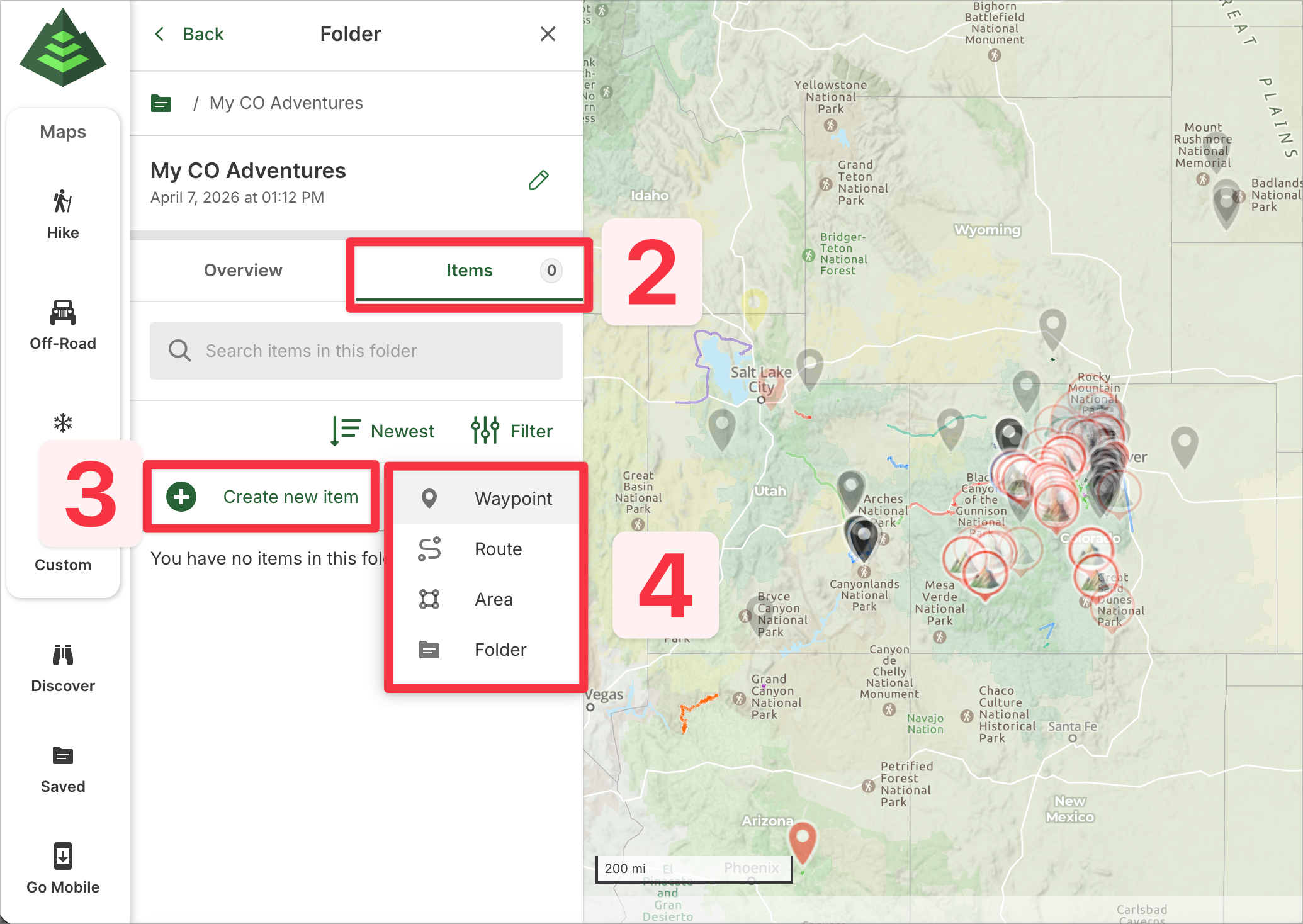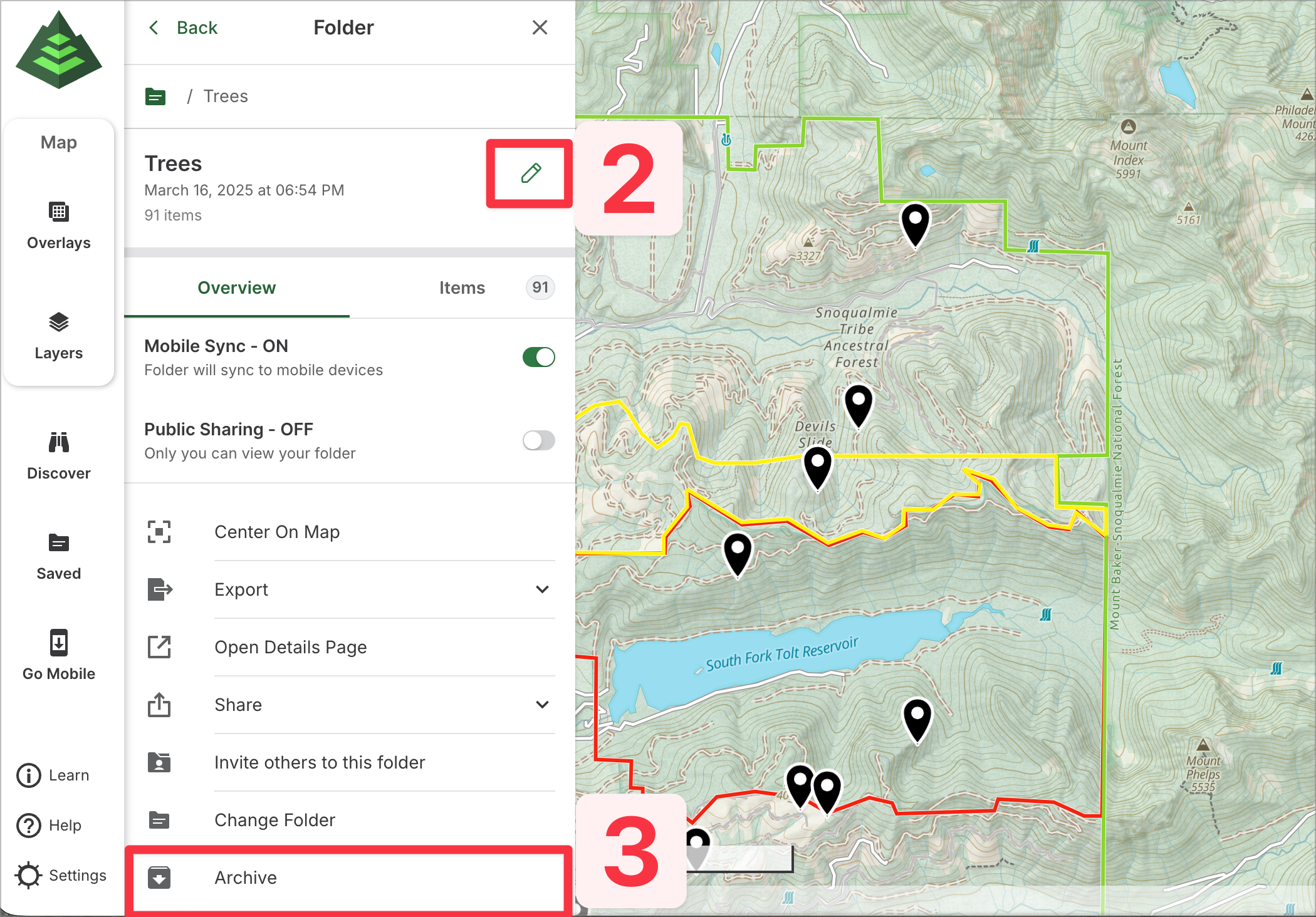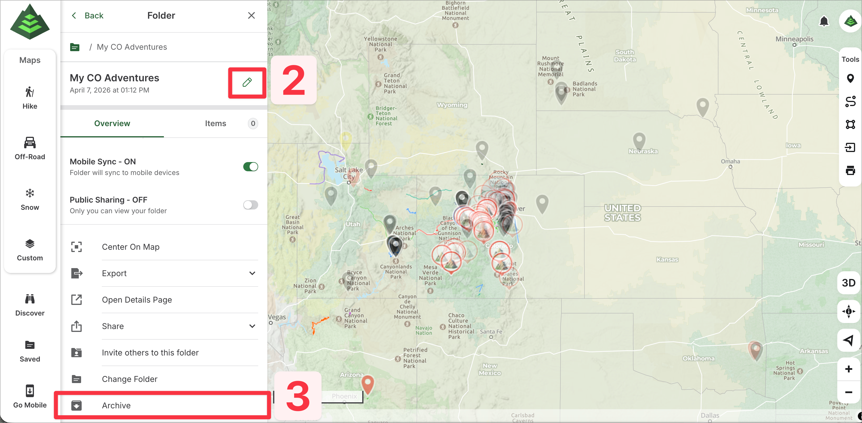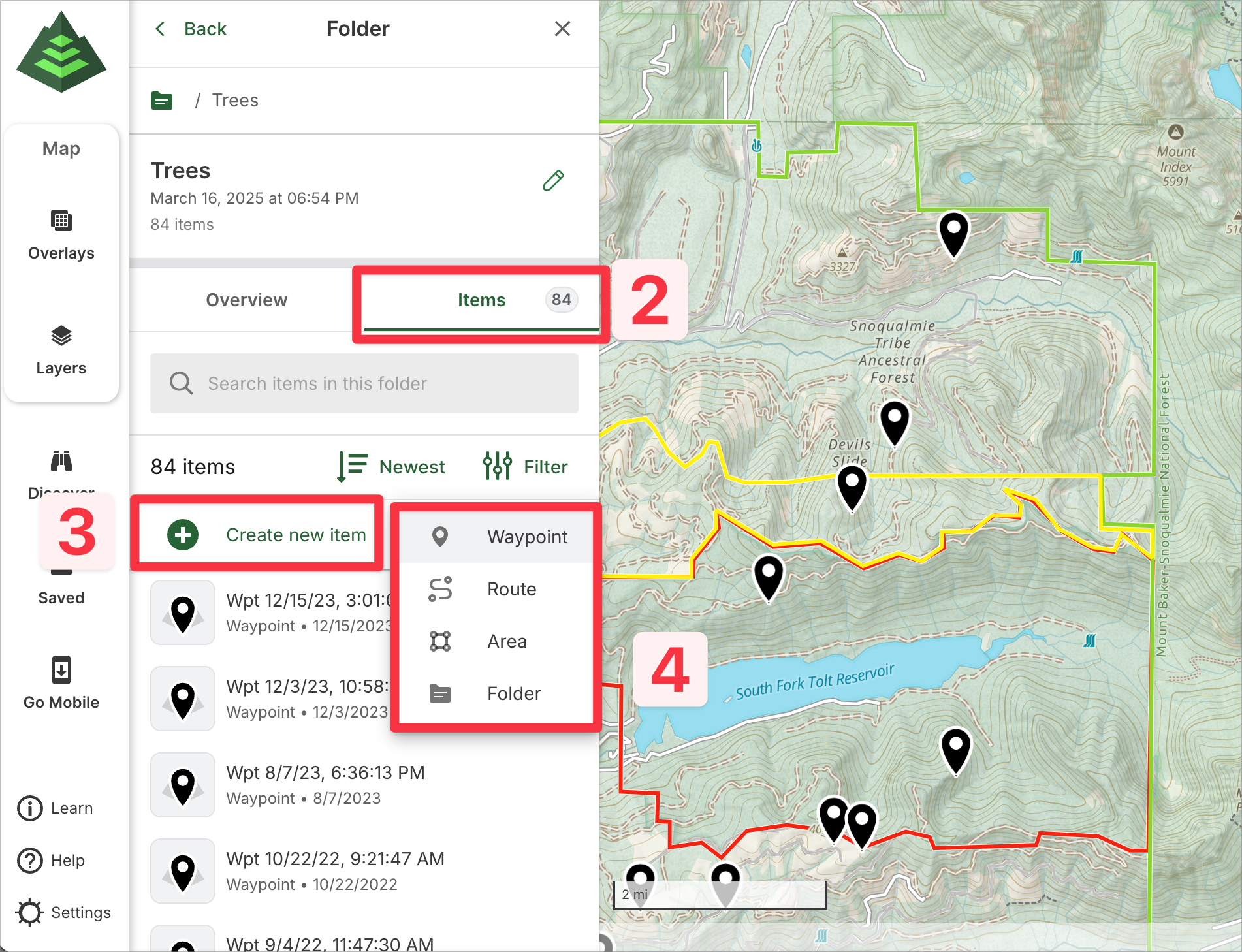 This article will guide you through managing folders on GaiaGPS.com. From the saved items sidebar on the web, you can easily view and organize your folders. Folders help you keep your planned routes, recorded tracks, waypoints, and other items neatly organized for quick access and better navigation.