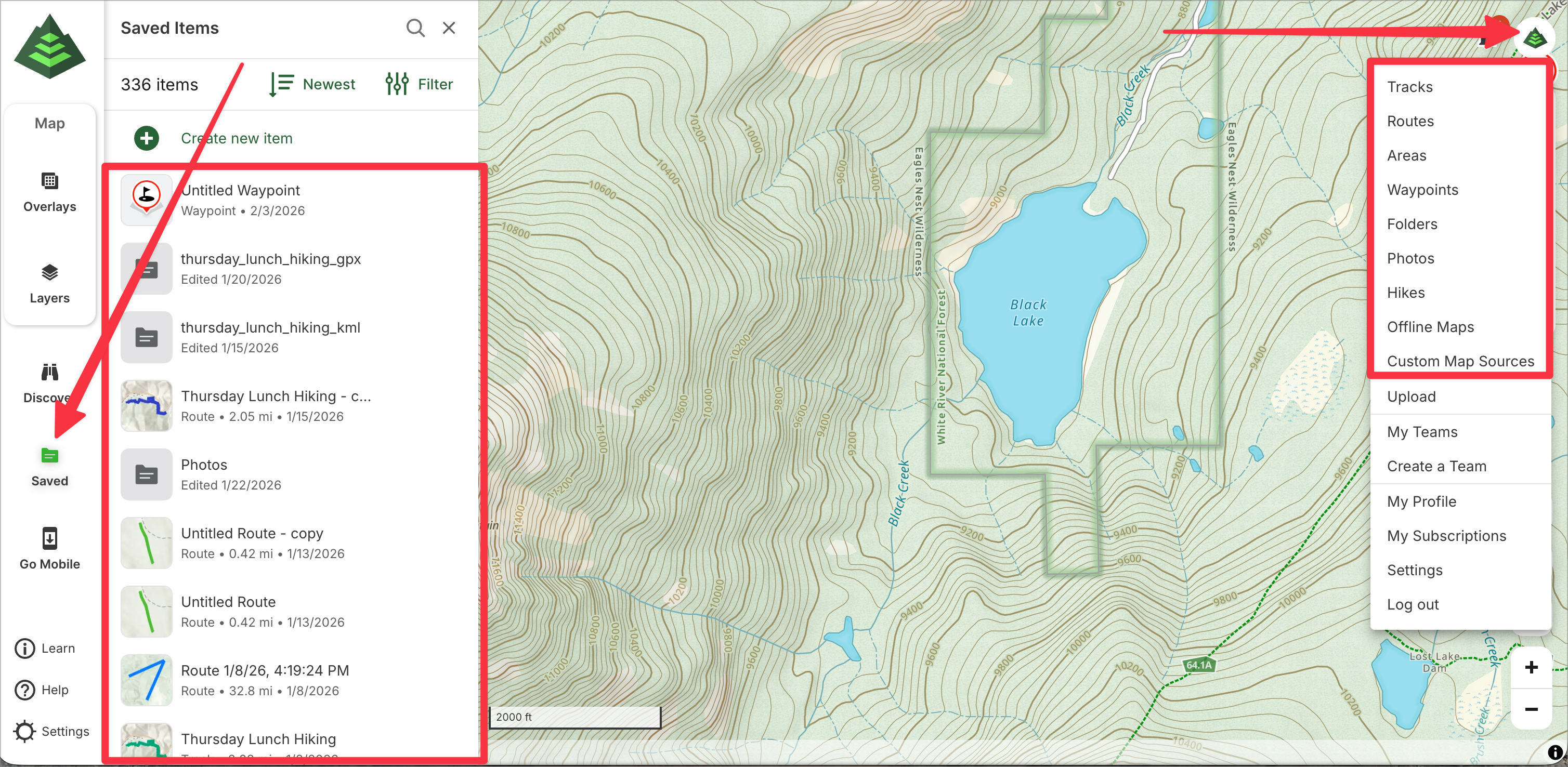 Note: the left sidebar does not show offline maps downloaded through the mobile app. You can view offline maps by clicking on the profile icon in the upper right corner > Maps.