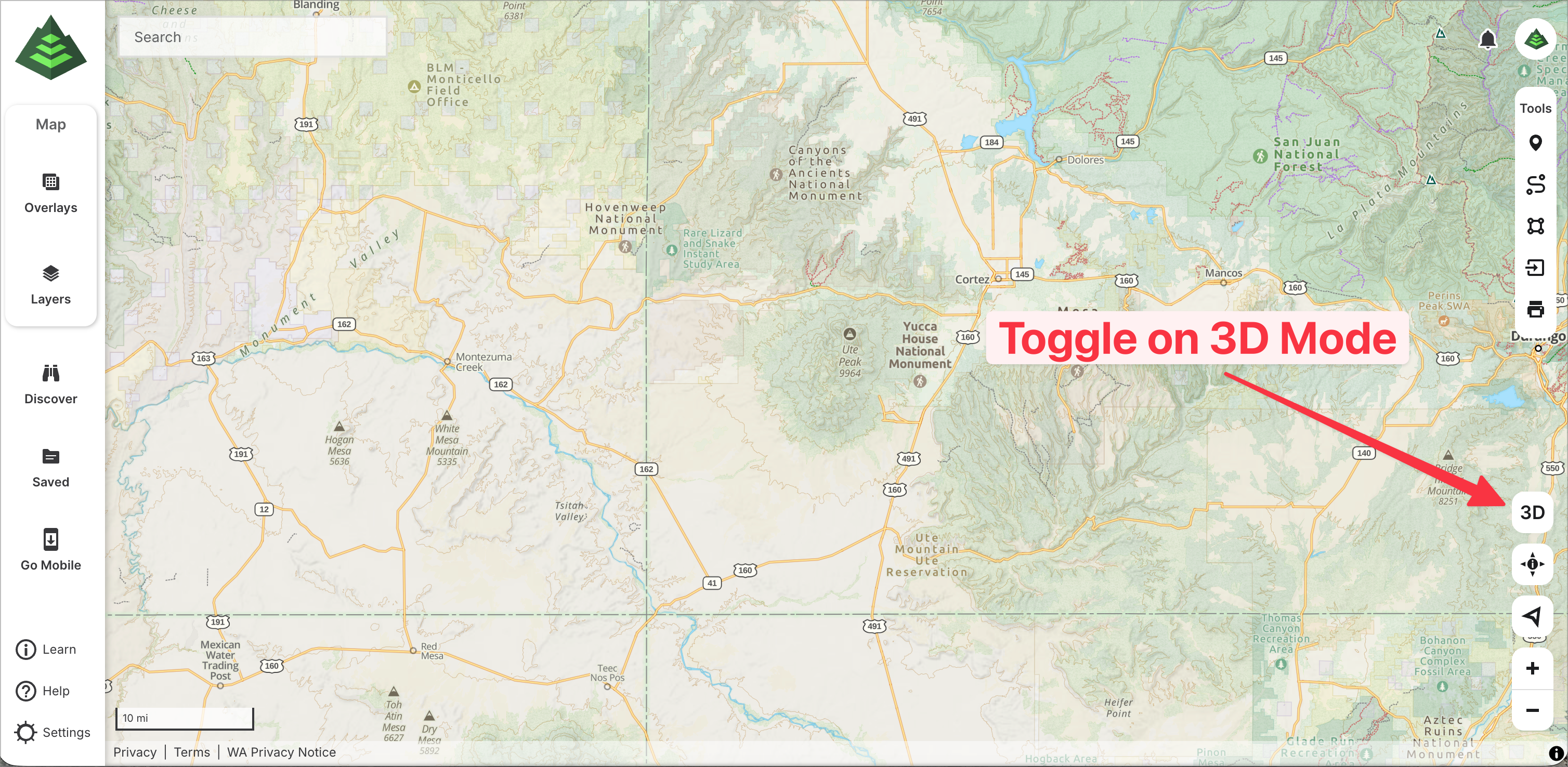 On gaiagps.com, pull up any map in the Gaia GPS map catalog. Turn on 3D mode by tapping the “3D” button on the lower right-hand corner of the screen.