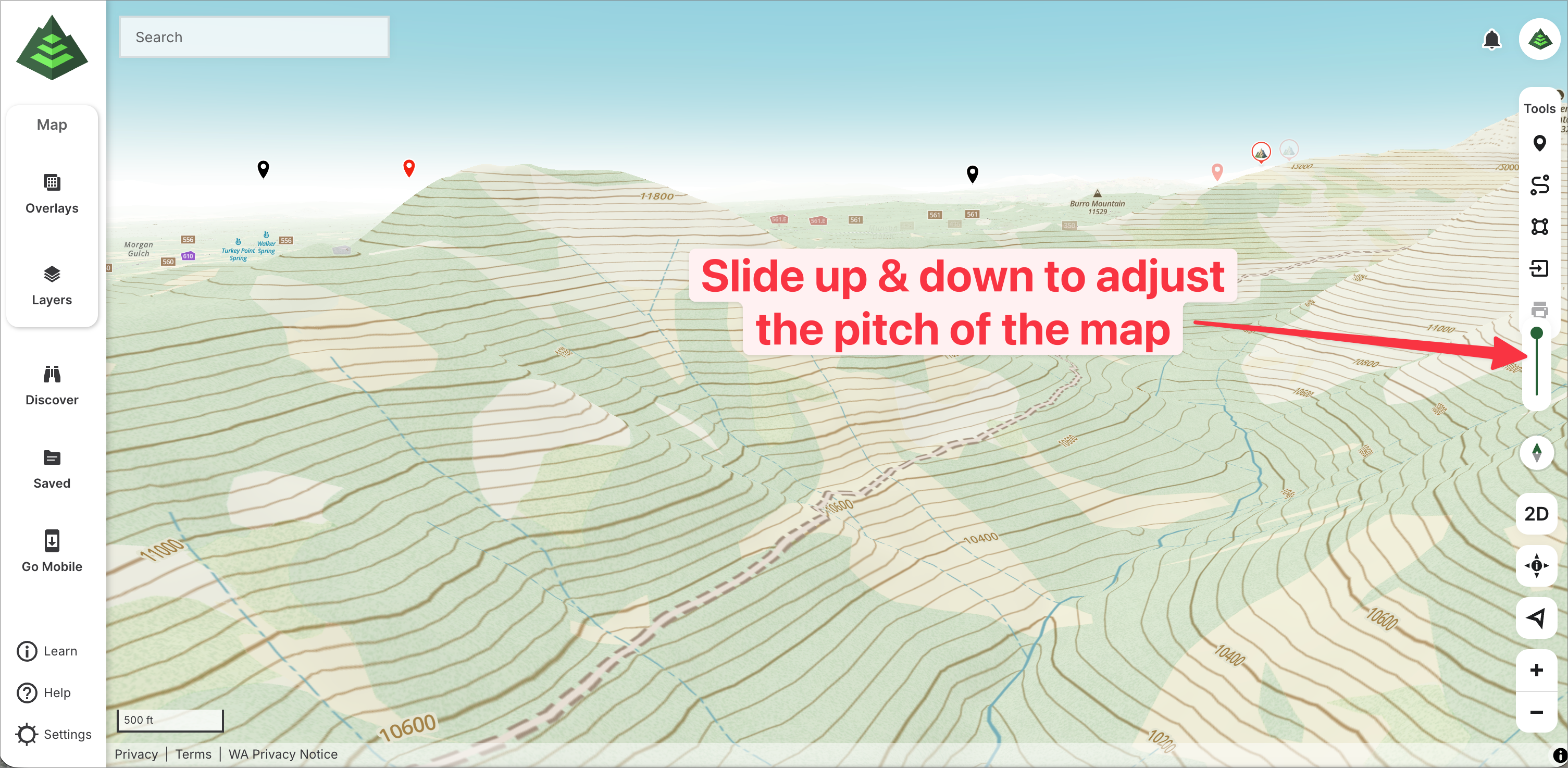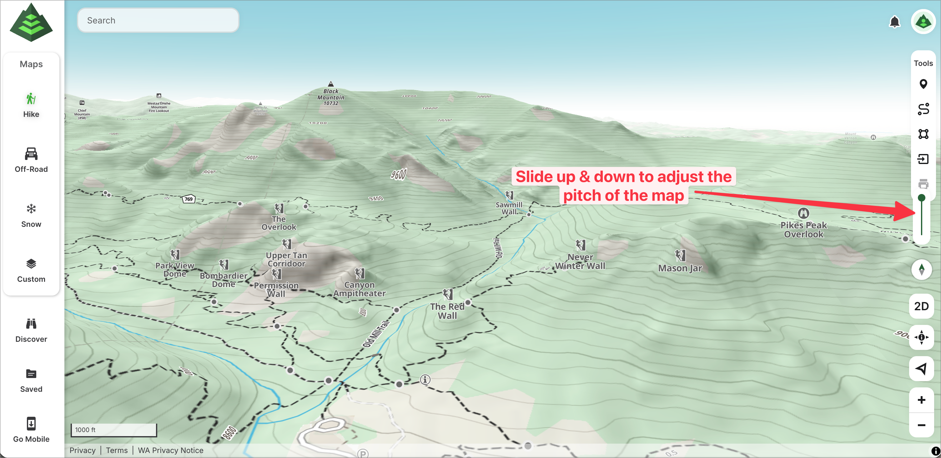 In 3D mode, use the vertical toggle slider to adjust the pitch of the map. Adjusting the pitch allows you to view the map from a bird’s eye view or sprawled out before you as if you are standing on a mountain top.