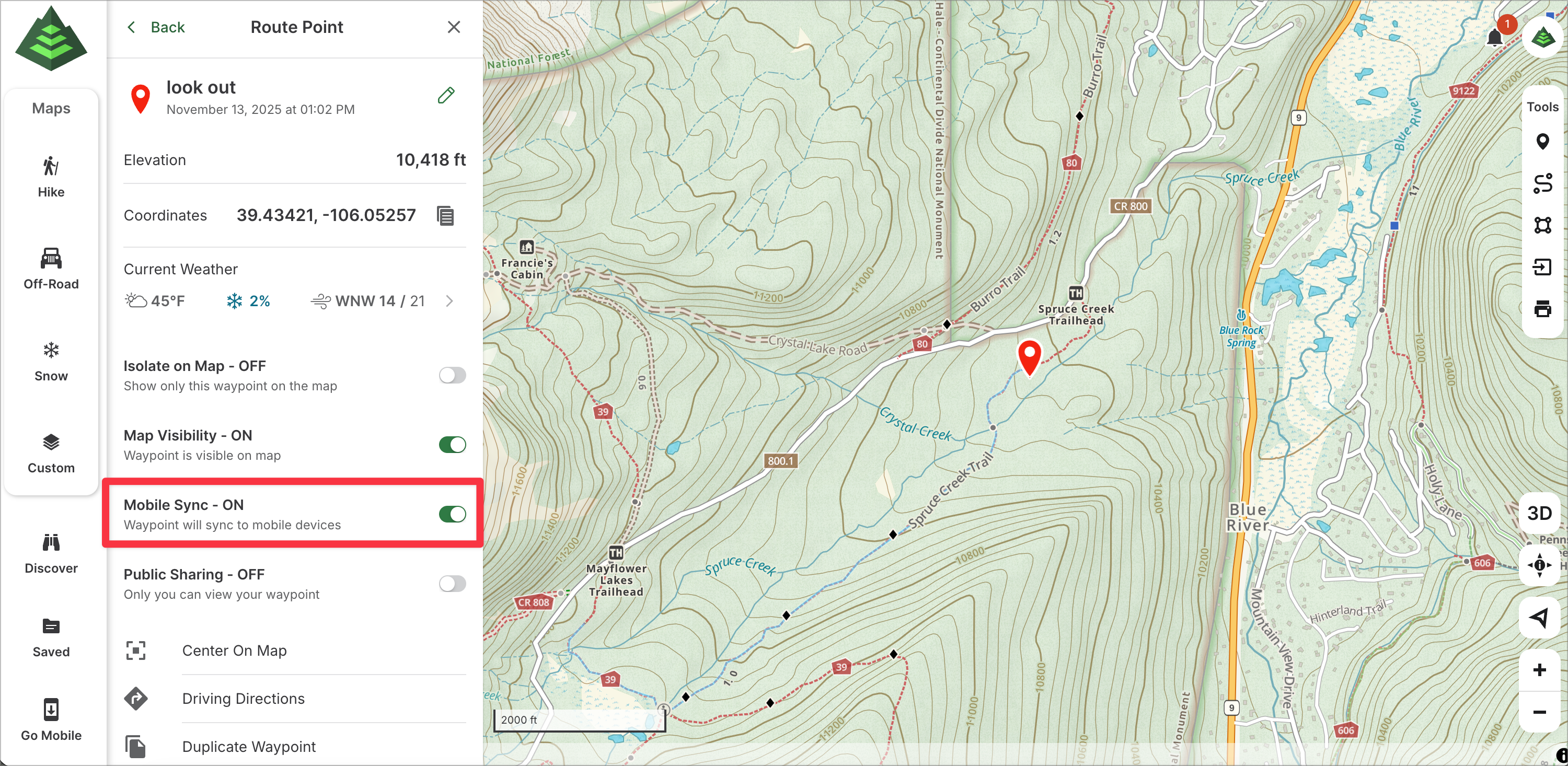 If you toggle Mobile Sync to OFF, the item will still be saved in your account, but it will not show up on your mobile device. This can be useful if you are just in the planning phase and want to see your options on gaiagps.com but wish to save and sync only one item for the actual trip (example: you are charting out your campsite options but wish to see only the campsite that you'll be staying at when it comes time for the trip).