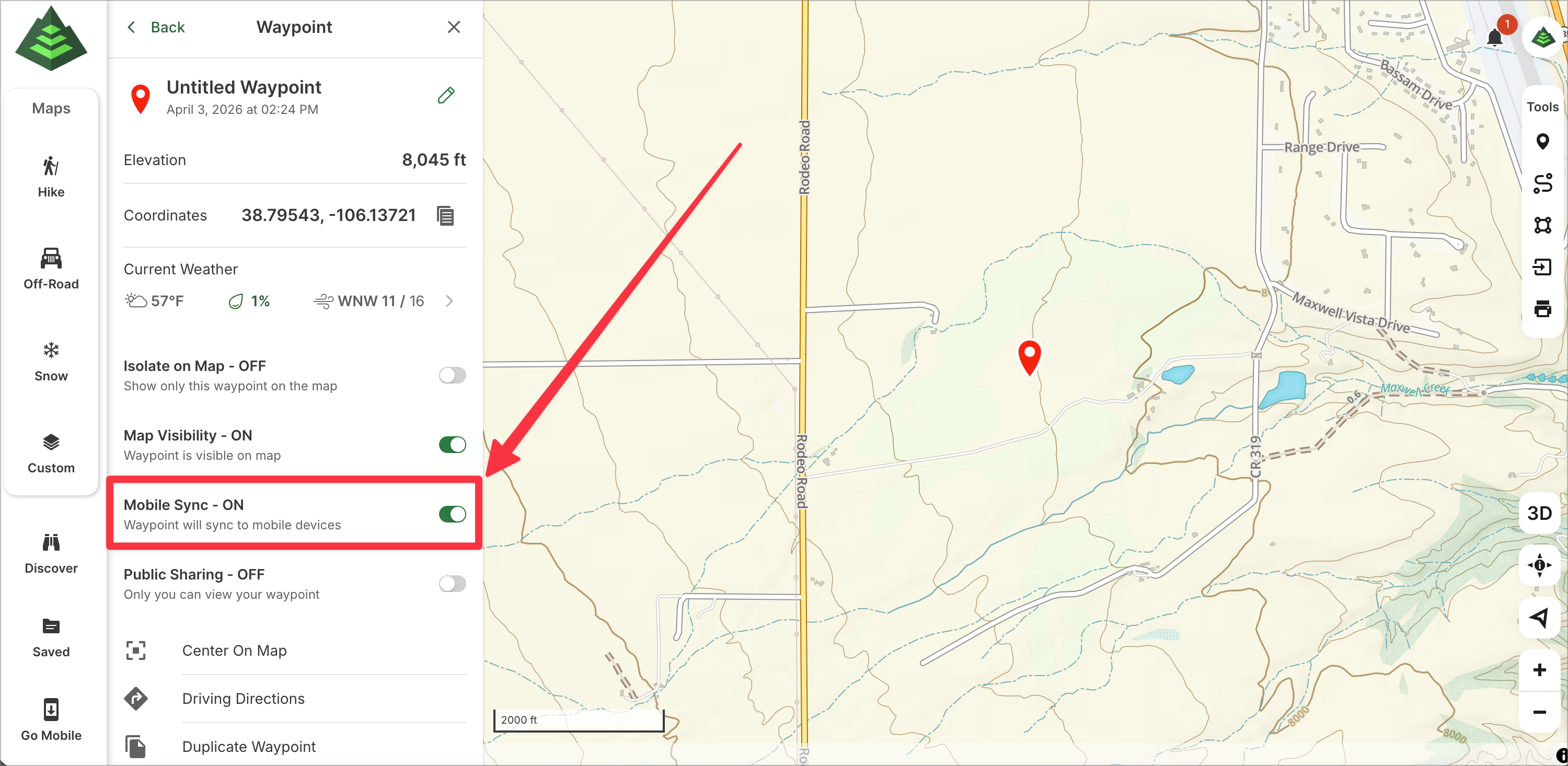 You can control Mobile Sync status for Waypoints, Tracks, Routes and Areas individually by clicking on the individual item in the sidebar and toggling Mobile Sync to ON. This option appears under the Map Visibility toggle.