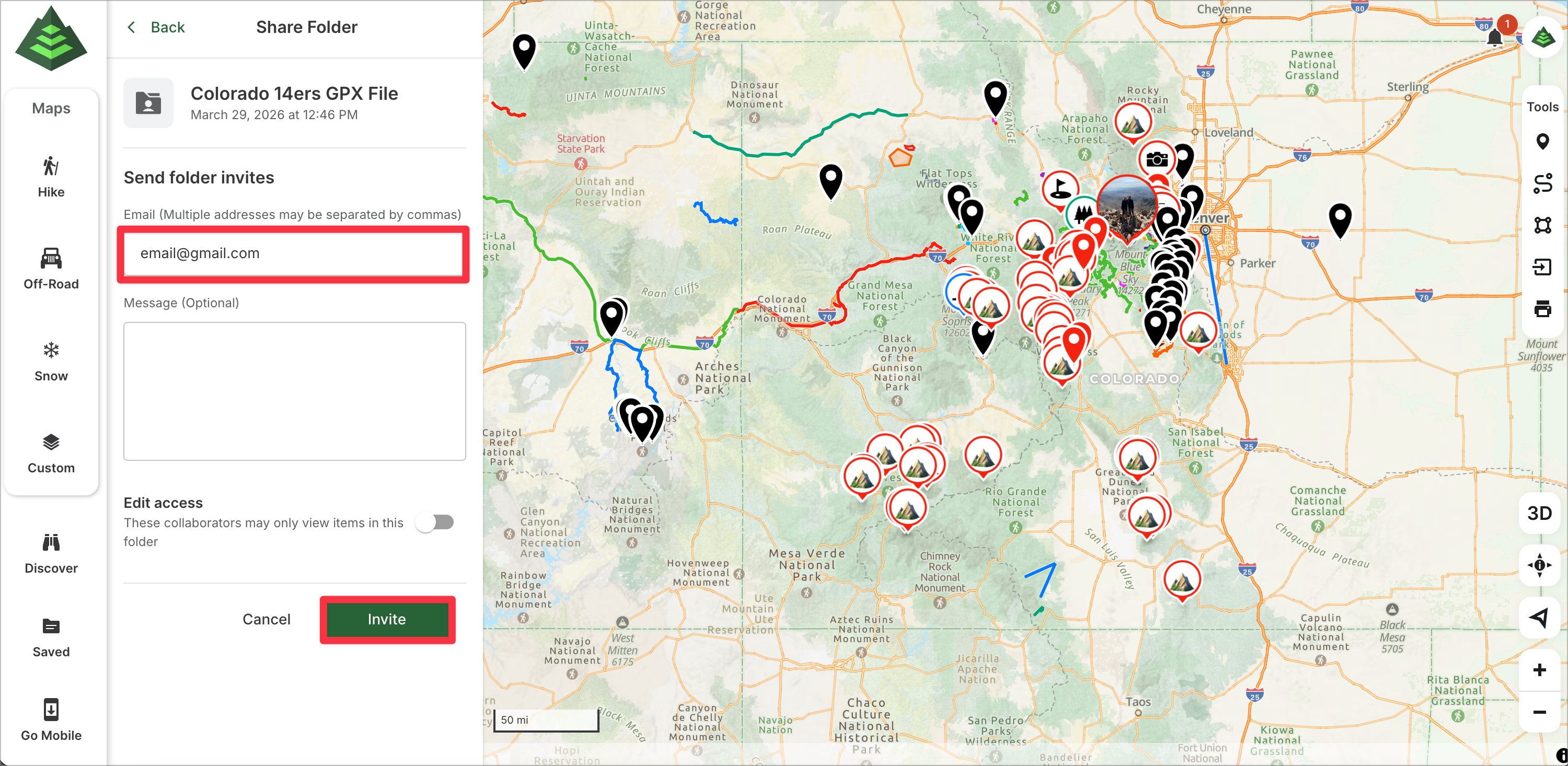 4. Enter the email(s) and add a message. By default, the folder access will be view only. To give edit access, toggle on "Edit Access." Finally, click "Invite."