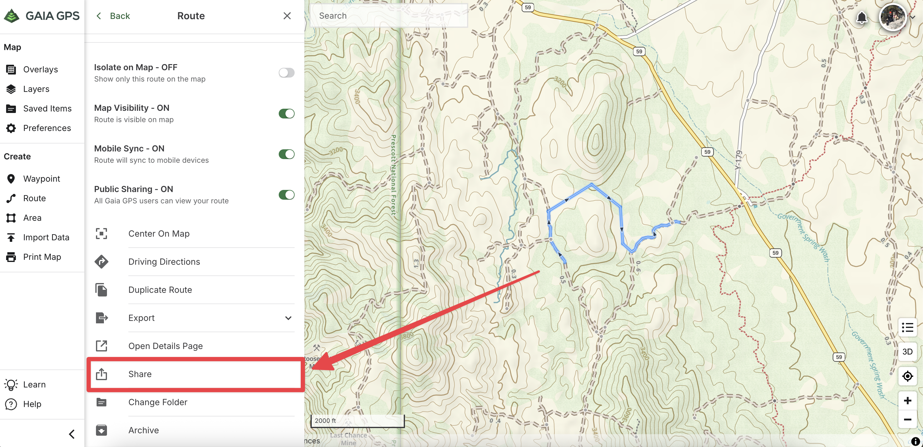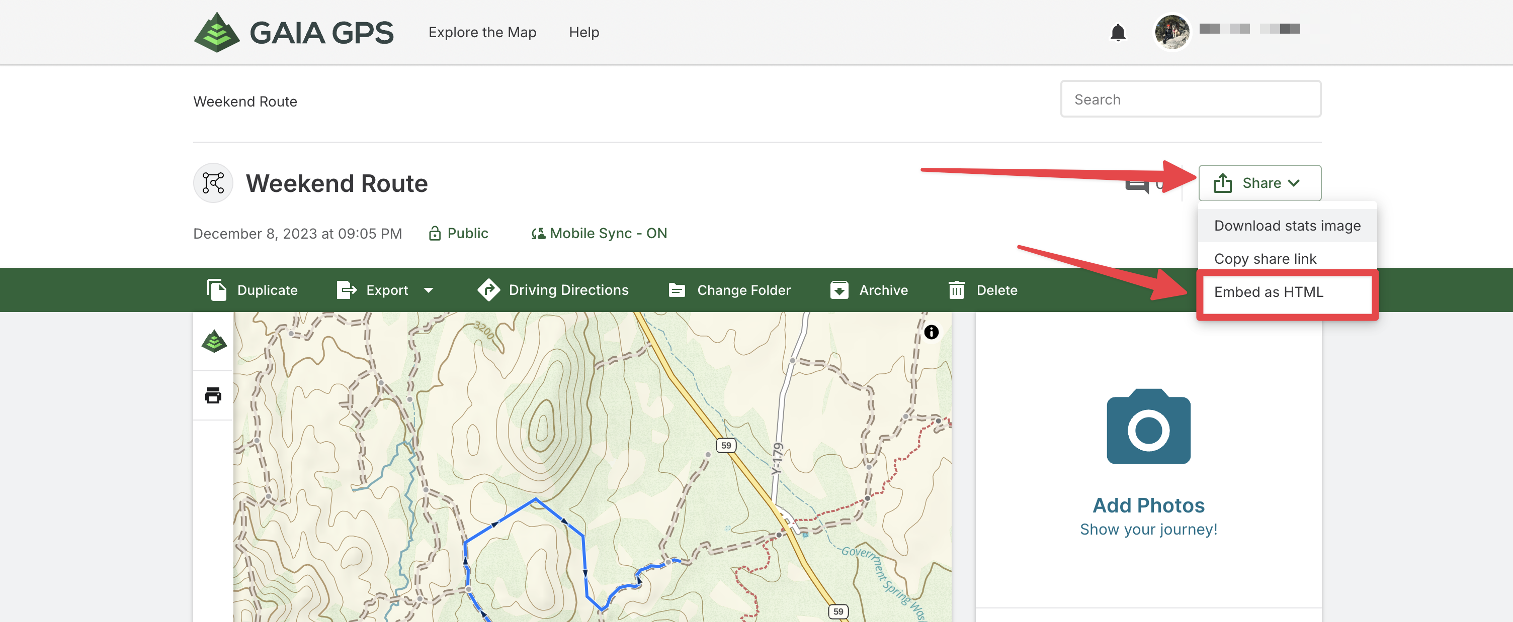 This article will show you how to share your tracks, routes, waypoints, and areas on gaiagps.com. You can share your tracks, routes, waypoints, areas, and folders via a direct link. You also have the option to embed code into your website to show the map and stats or download a stats image for tracks and routes.