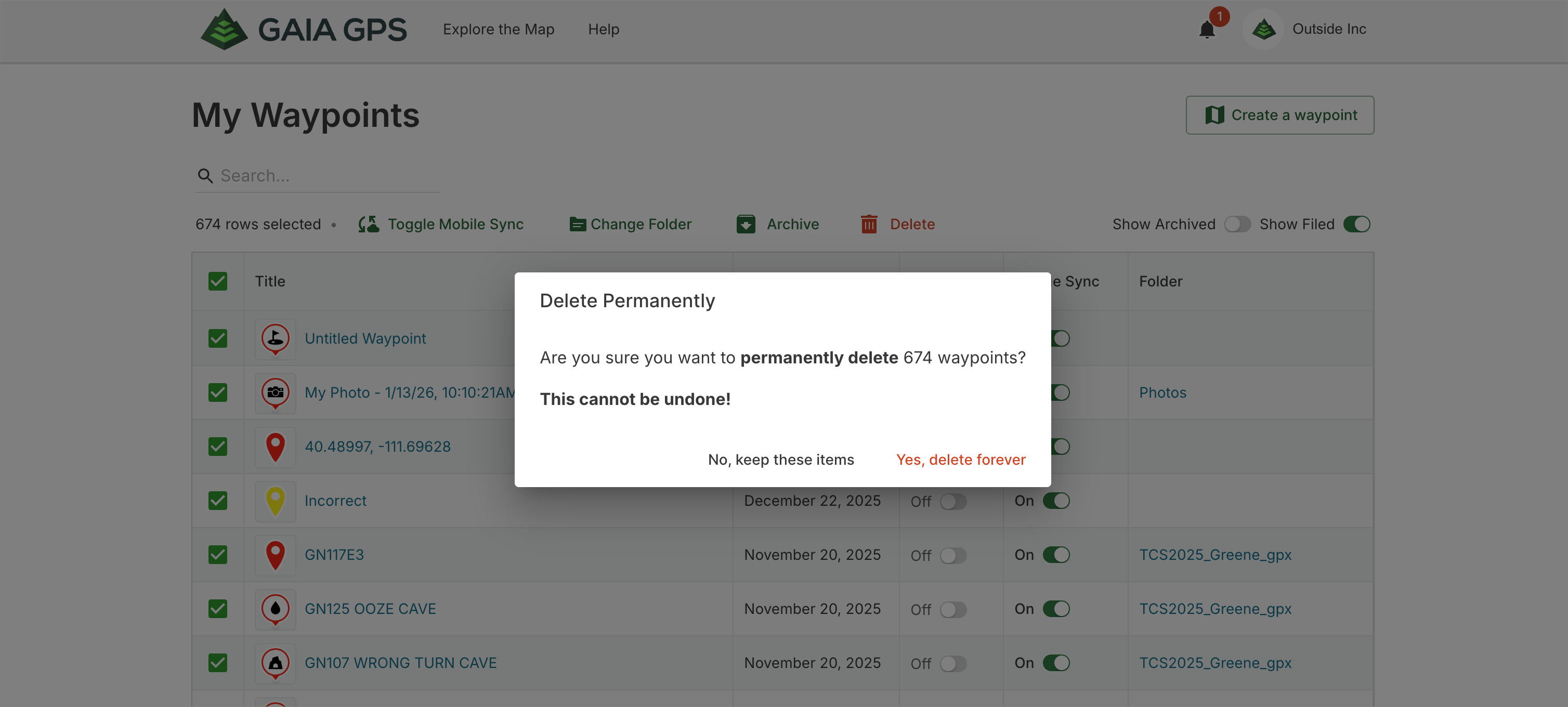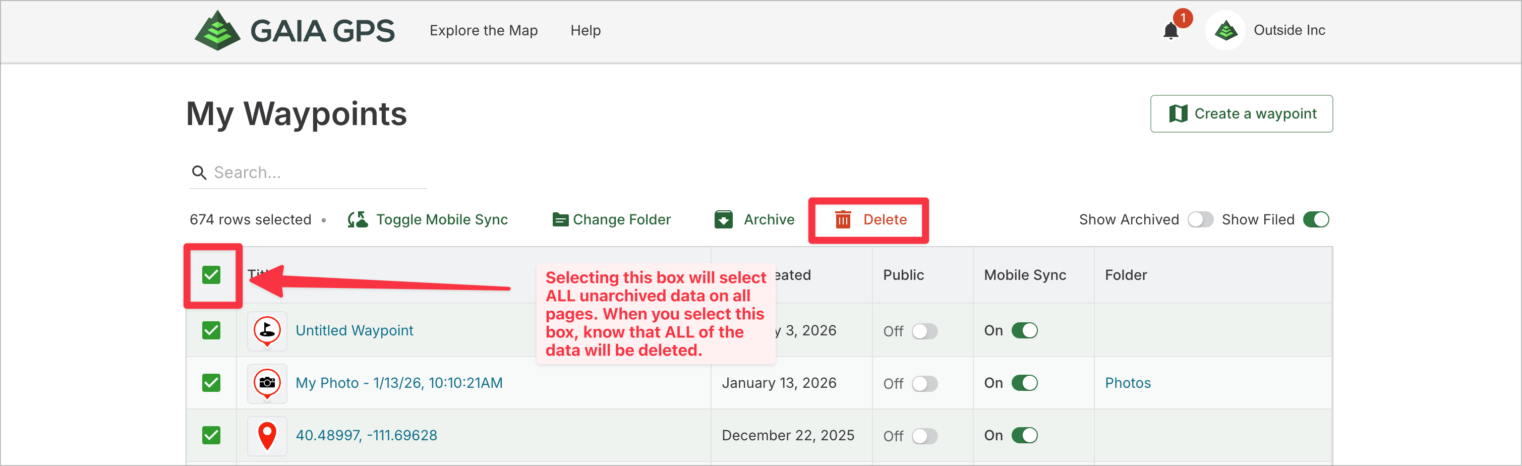 If you wish only to remove the data from your mobile device, you can toggle Mobile Sync off. The data will remain on gaiagps.com, but you will not sync this data to your mobile device. If you wish to keep the data, but not see the data as active on gaiagps.com or your mobile device, archive the data.