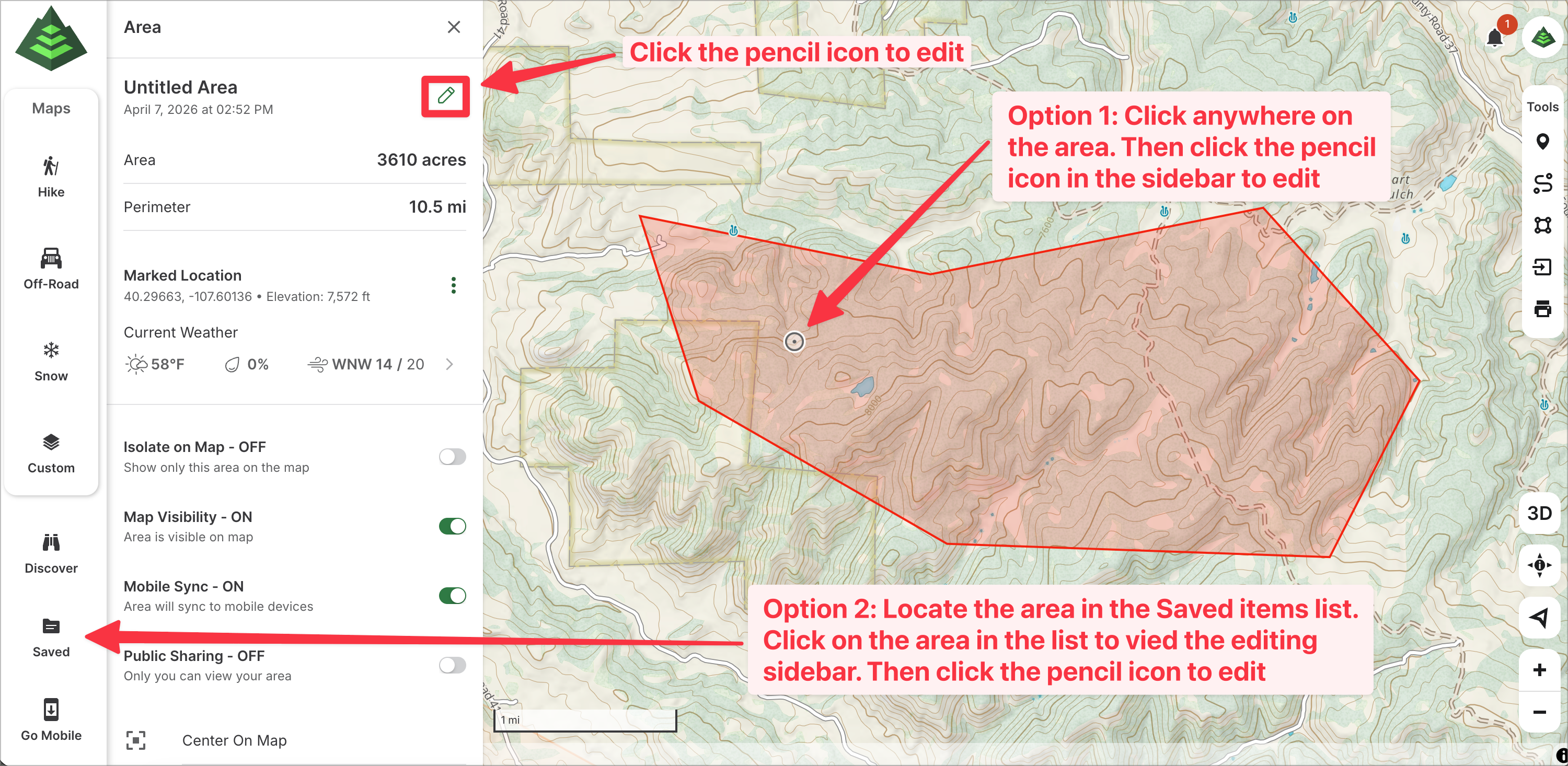 - Option 2: Click 'Saved' in the side menu panel, locate the area in the Saved items list, click on the area in the list to view the editing menu, then click the pencil icon to edit: