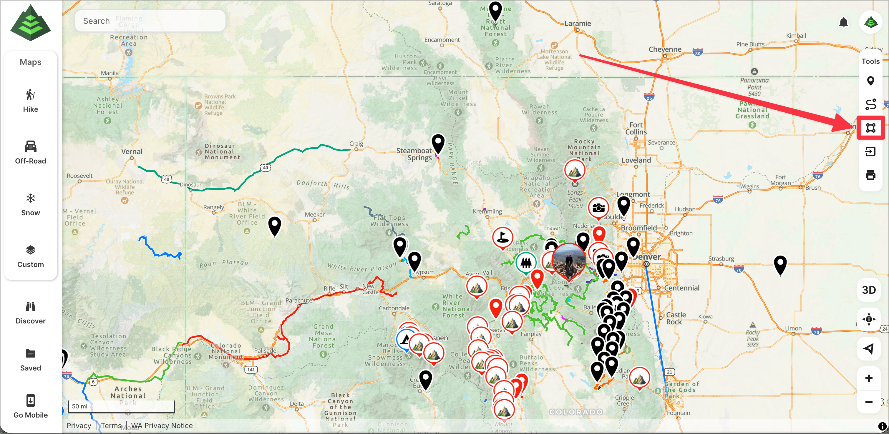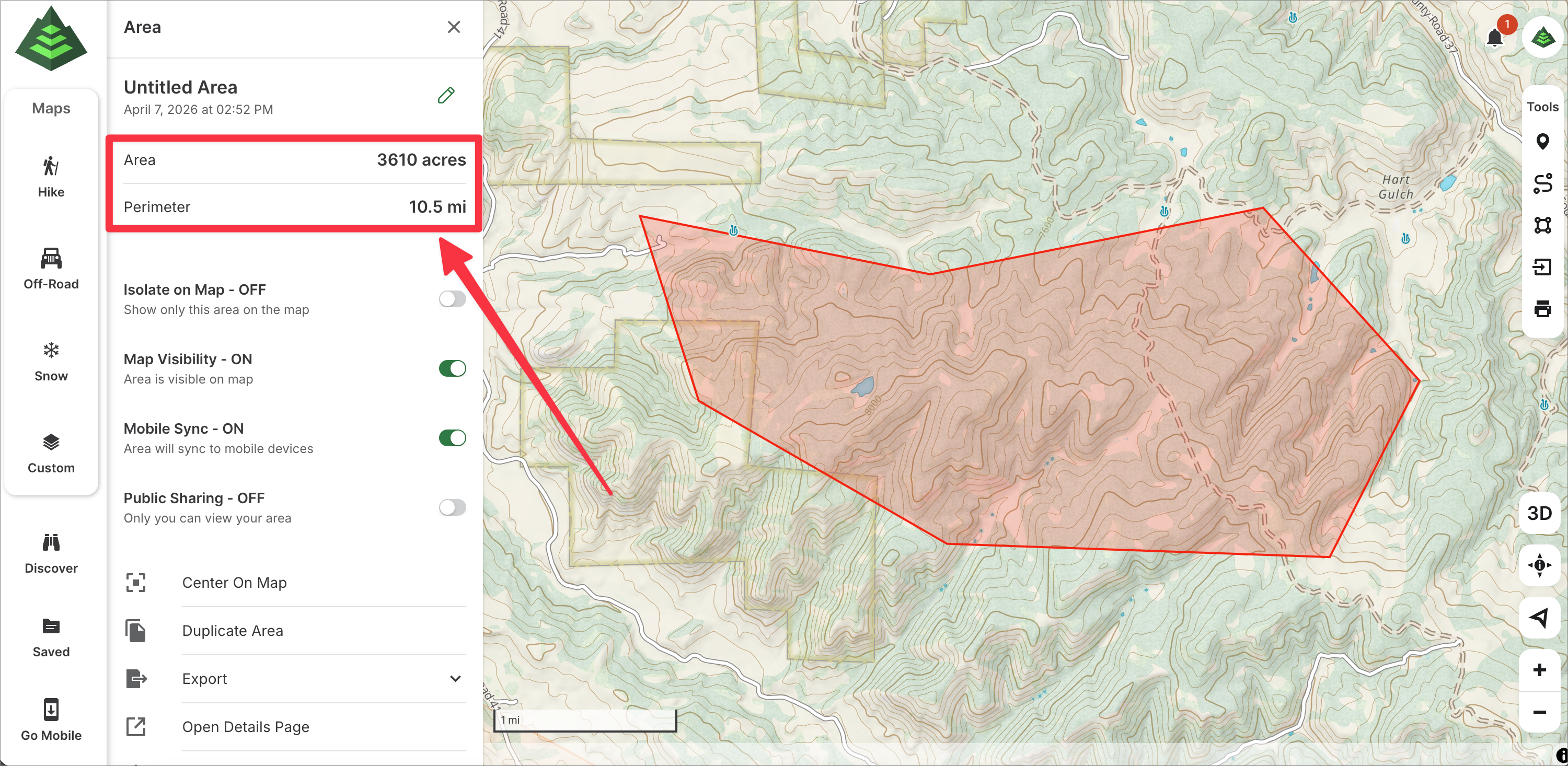 1. Go to www.gaiagps.com/map and click on the area tool on the right menu bar: