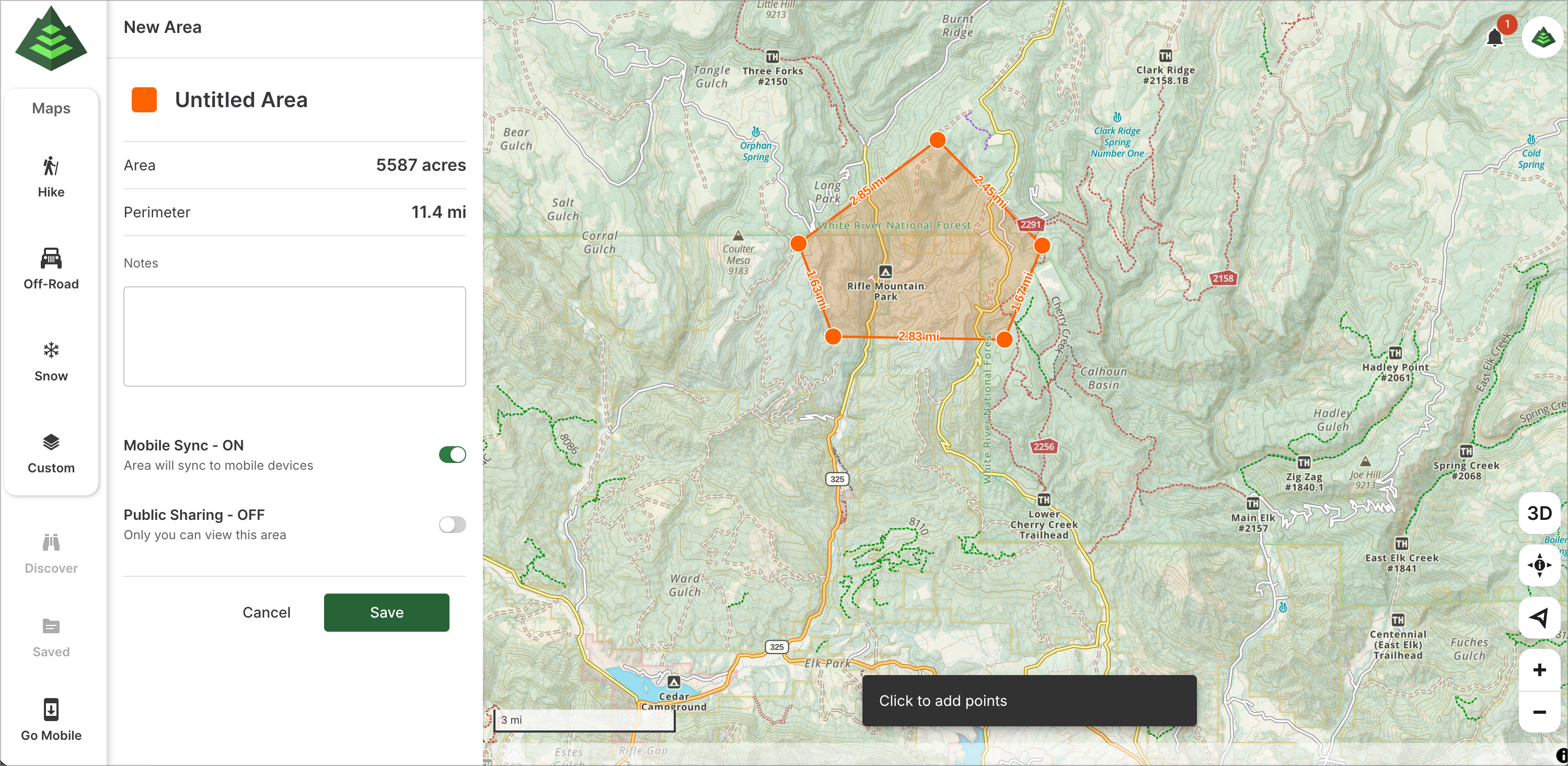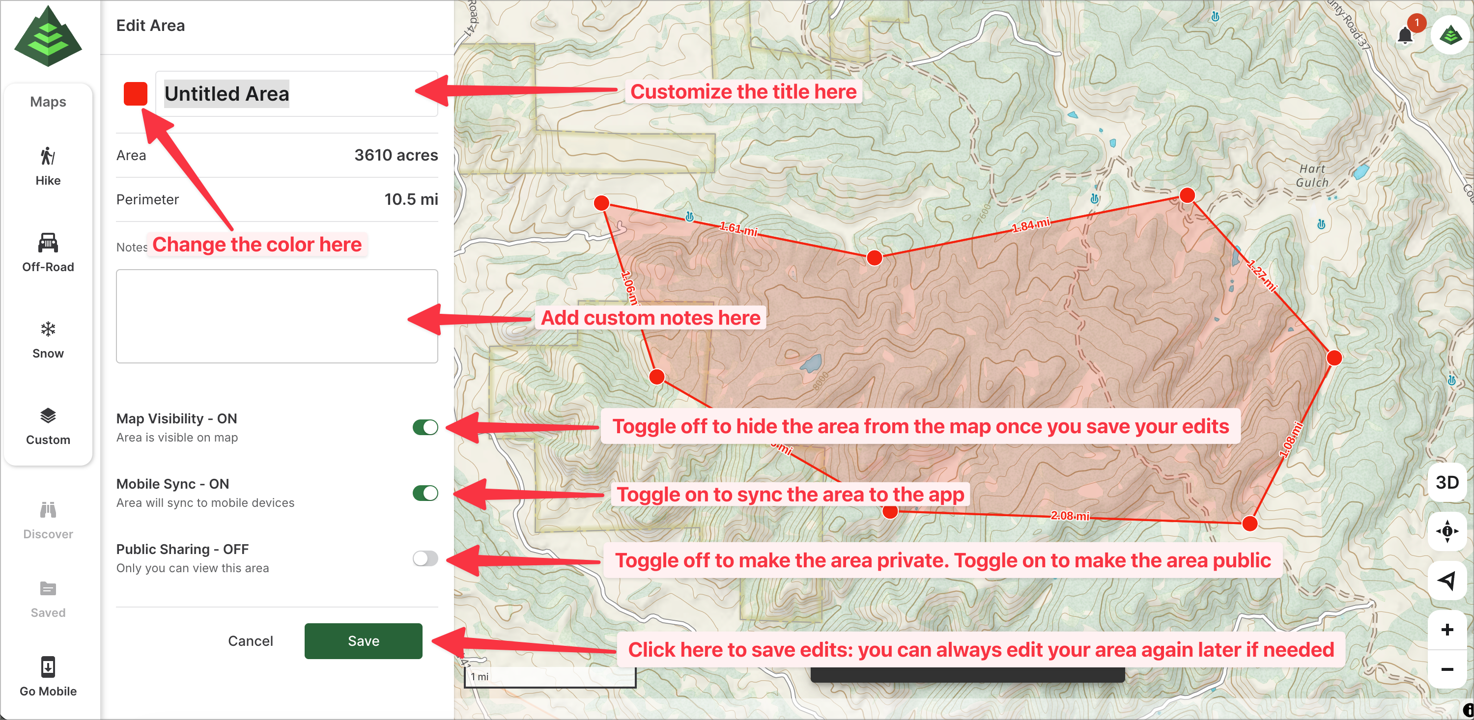 4. Once you have established the area, you can customize the color, title, notes, and visibility. This can also be added or edited later if desired. Click "Save" to save the area.